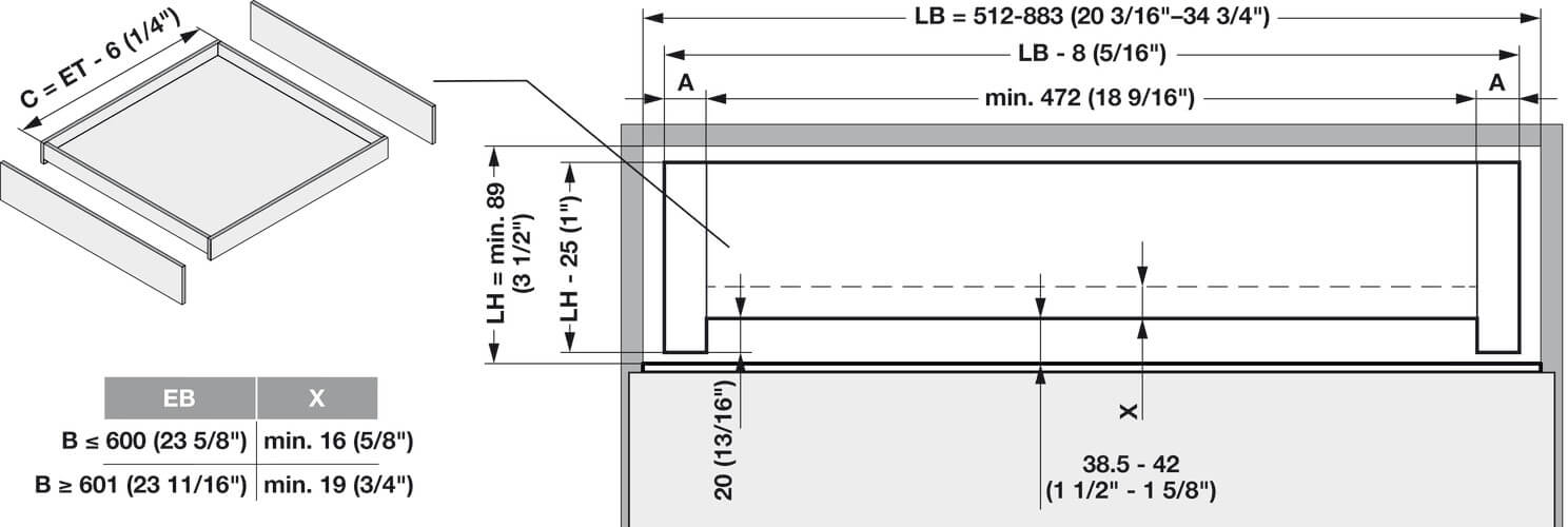 - Interior height: min./max. 89–216 mm (3 1/2"–8 1/2")
