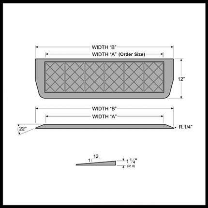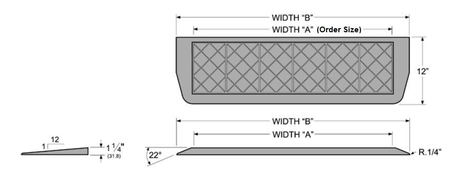 How to Order: Order size is width of top flat surface of ramp, before miter returns begin sloping downward (Dimension A in Product Specs). Width can be slightly trimmed on the field.