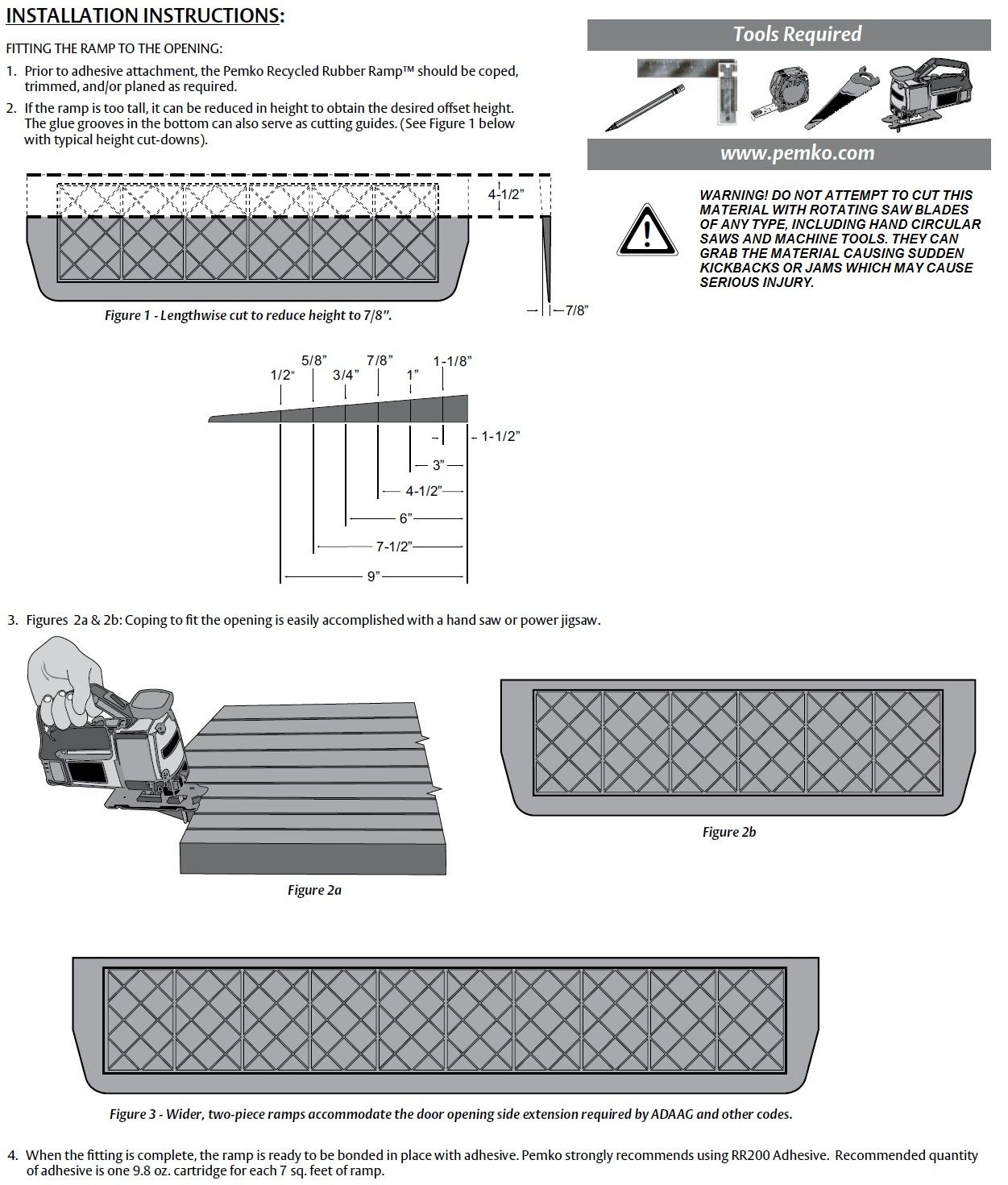 InstallationThe manufacturer strongly recommends RR200 (T-Rex) to glue rubber to floor surface. (Liquid Nails is NOT recommended for this product). Ramp can be field cut and coped.