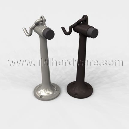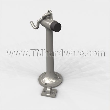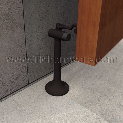 Deltana 8" floor mount bumper is generally used for exterior doors with a step down. Our solid brass, extra tall bumper can be used as a door holder as well, featuring a hook and eye for just that purpose. This heavy duty product is great for all commercial and residential applications and is equipped with concrete and wood mounting hardware. A large array of finishes is available.