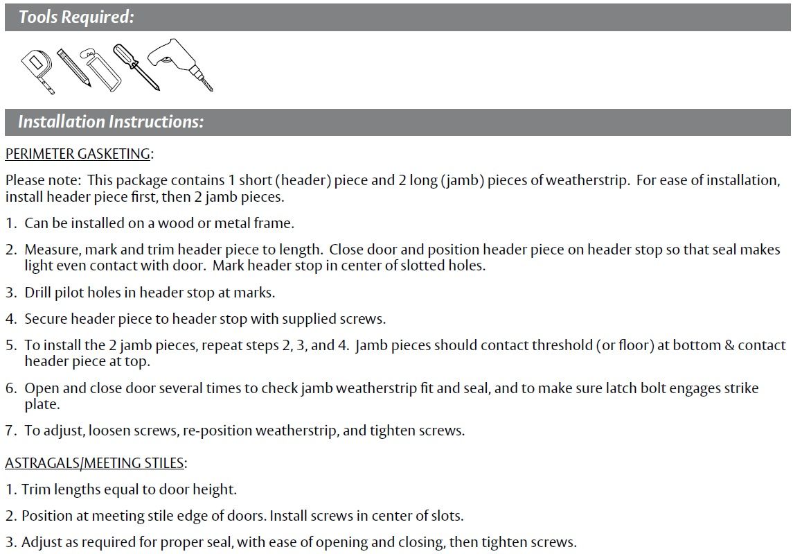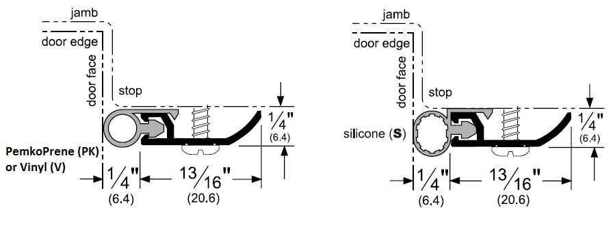 Door Gasket: Applied around the perimeter of the door. The aluminum retainer is surface applied to the stop of the door. When closed, the door compresses the seal to form a solid barrier. It is designed for gaps of 1/16" but can seal up to 1/4".