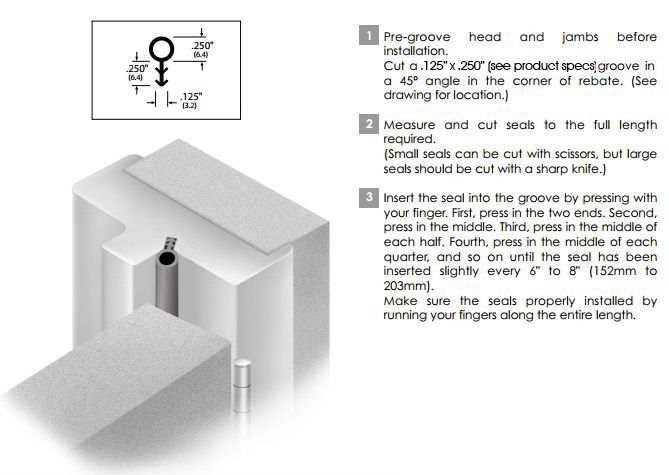 To install, simply insert the extending fin into a .250" x .125” kerf, or groove, and push in with the aid of a putty knife to get a tight fit (see product specs).