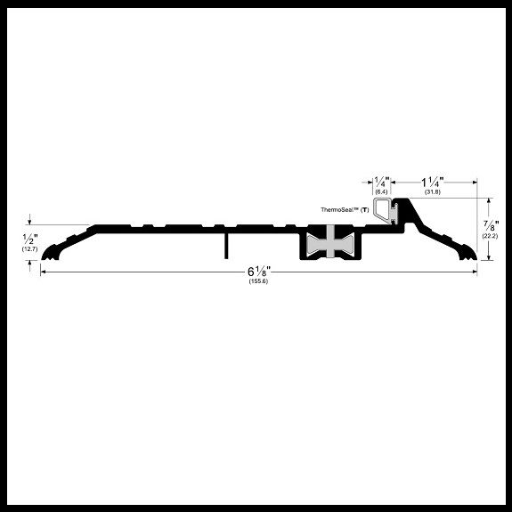 Threshold is fitted with a black rigid polypropylene break which reduces heat loss and prevents frost build up on the interior surface of the saddle. The threshold design is compatible with a surface applied vertical rod exit device.