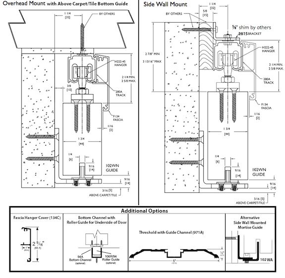 Additional Customization Options: Including dual bottom guide, roller guide, guide channel and surface mounted door thresholds are available. See customization tab to the right and detailed images above for more on these products.