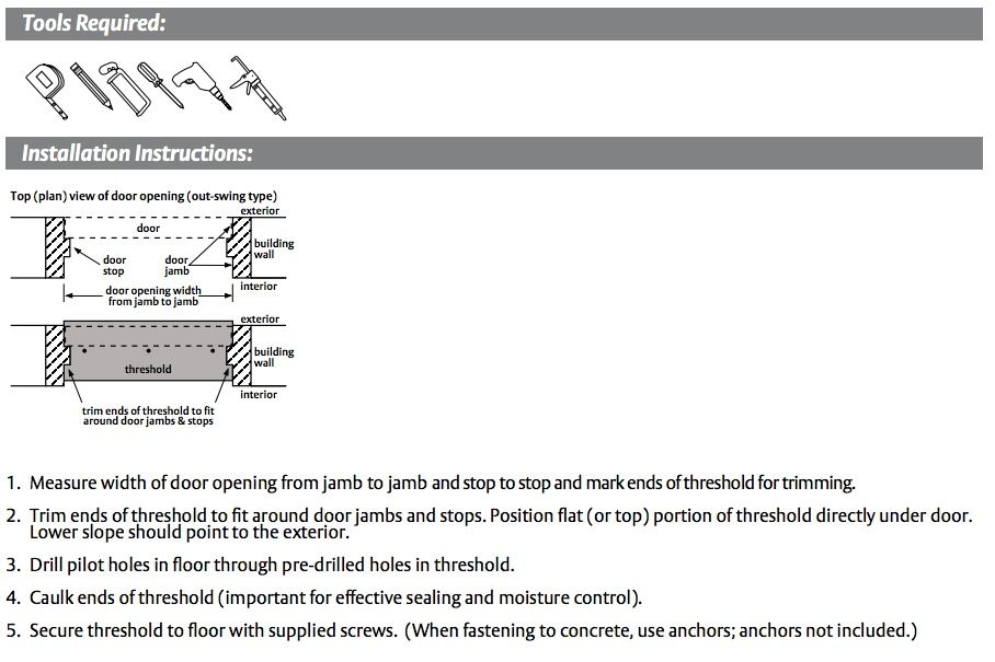 Installation: Installation Guide and screws provided. Screws are colored to coordinate with threshold color.