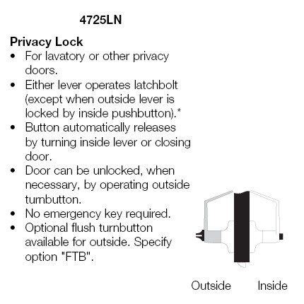- Either lever operates latchbolt (except when outside lever is locked by inside pushbutton).