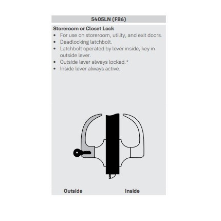 Designed for industrial and commercial use, the Accentra (Formerly Yale) 5405LN Cylindrical Grade 1 Storeroom Lever is an ideal choice for doors requiring latching with keyway. The 5405LN is certified to ANSI/BHMA Grade 1standards and is 3 hour UL Fire Rated.