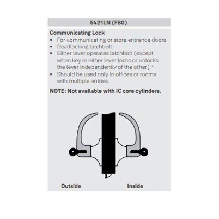 Designed for industrial and commercial use, the Accentra 5421LN Cylindrical Grade 1 Communicating or Store entry Lever is an ideal choice for doors requiring locking with Keyway. The 5421LN is certified to ANSI/BHMA Grade 1standards and is 3 hour UL Fire Rated.