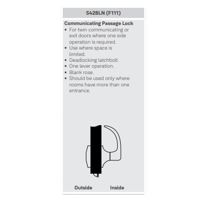 Designed for industrial and commercial use, the Accentra (Formerly Yale) 5428LN Cylindrical Grade 1 Communicating Passage Lever is an ideal choice for doors requiring latching, without locking. The 5428LN is certified to ANSI/BHMA Grade 1standards and is 3 hour UL Fire Rated.