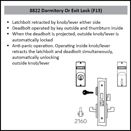 Accentra (Formerly Yale) 8822FL Mortised Dormitory Or Exit Lockset is designed and manufactured for uncompromising strength and durability in a range of commercial applications. This lockset is exceeds ANSI / BHMA Grade 1 Standards and 3 Hour UL-Fire Rated.