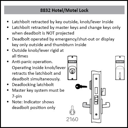 Accentra (Formerly Yale) 8832FL Mortised Hotel or Motel Lockset is designed and manufactured for uncompromising strength and durability in a range of commercial applications. This lockset is exceeds ANSI / BHMA Grade 1 Standards and 3 Hour UL-Fire Rated.