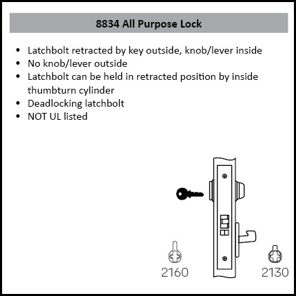 Accentra (Formerly Yale) 8834FL Mortised All Purpose Lockset is designed and manufactured for uncompromising strength and durability in a range of commercial applications. This lockset is exceeds ANSI / BHMA Grade 1 Standards and 3 Hour UL-Fire Rated.