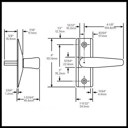 Escutcheon: A 1/4" square heat-treated spindle is part of the escutcheon assembly, which interlocks with the cam plug. Finished to match lever. Handle uses the same sloping 1-3/8" x 4" escutcheon, designed to match the clean lines of a narrow stile door.