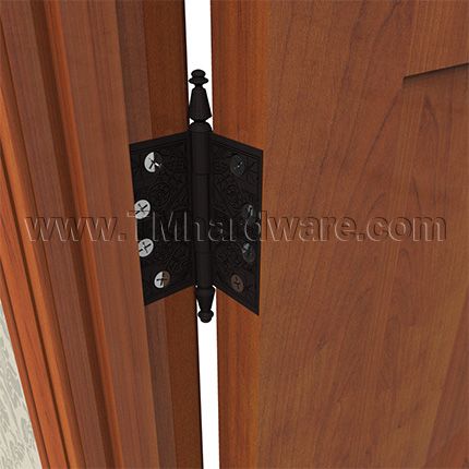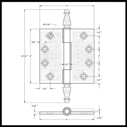 Deltana DSBP44 3 Knuckle, Plain Bearing Ornate Hinges have highly decorative, cast engraved leaves and are packed with traditional slotted screws. It is made of Solid Brass. Size of hinges is 4" x 4" with Steeple Tip Finials. Available in choice of finishes.