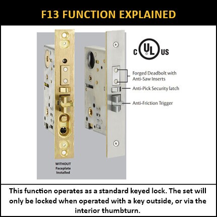 - EM3325 Single Cylinder UL Listed F13 Lockbox: This function operates as a standard keyed lock. The set will only be locked when operated with a key outside, or via the interior thumbturn.