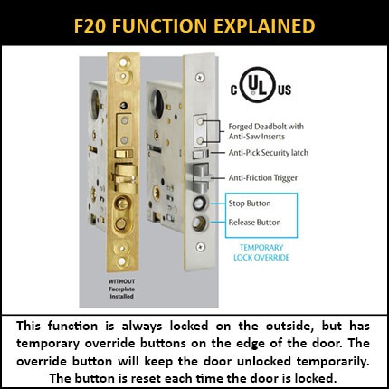 - EM3325 Single Cylinder UL Listed F20 Lockbox: This function is always locked on the outside, but has temporary override buttons on the edge of the door. The override button will keep the door unlocked temporarily. The button is reset each time the door is locked.