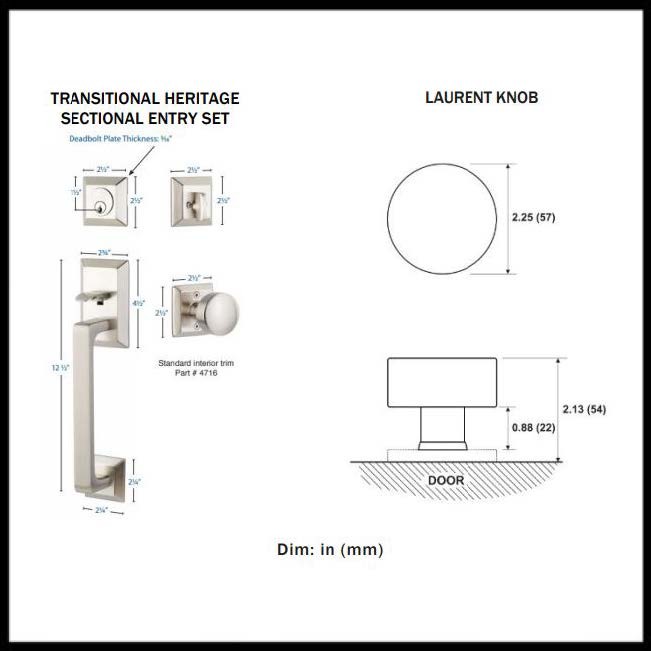 Parts IncludedTransitional Heritage Sectional Entry Set, Laurent Knob, Strike Plate, Latch, Screws