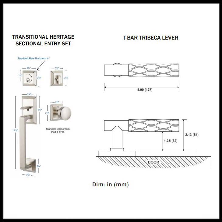 Parts IncludedTransitional Heritage Sectional Entry Set, T-Bar Tribeca Lever, Strike Plate, Latch, Screws