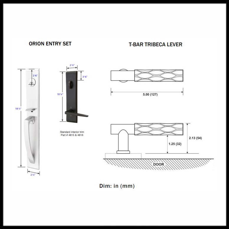 Parts IncludedOrion Entry Set, T-Bar Tribeca Lever, Strike Plate, Latch, Screws