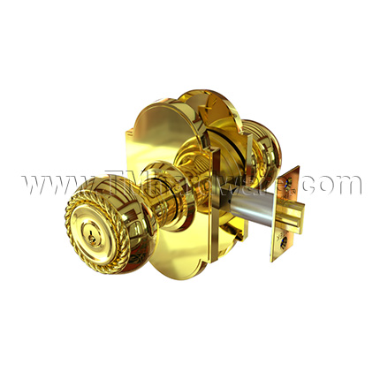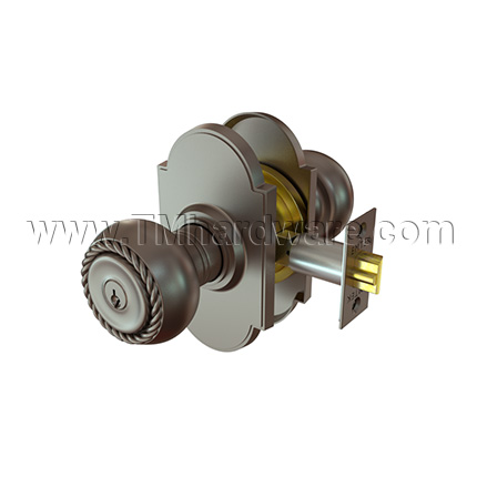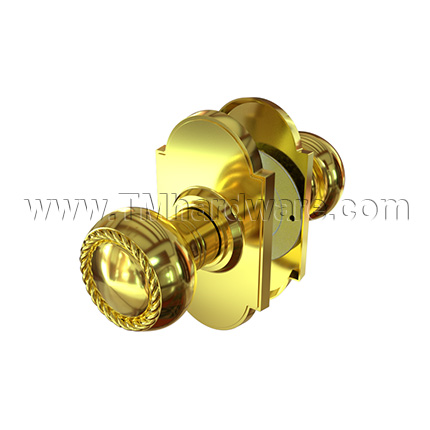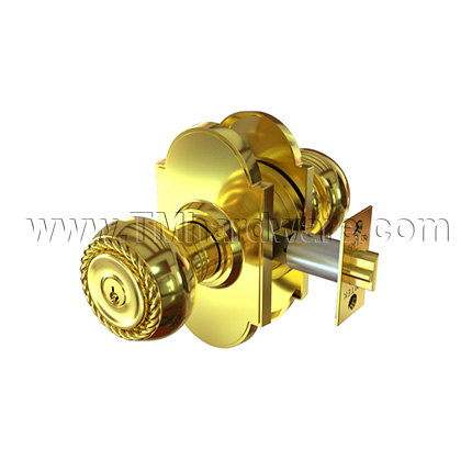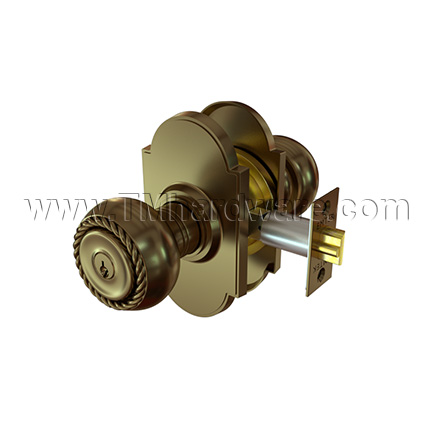 Emtek Keyed in Knob with #8 Rosette and Rope Knob is available in Entry Function (5108RK) or Dummy Function (5158RK). This American Heritage doorknob is Classic Brass and will give any door a unique style. It fits any door between 1-3/8” to 1-3/4" thick with a 2-1/8" bore standard door prep.