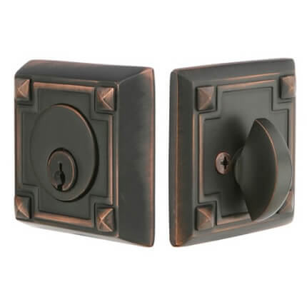 Emtek #8454 Arts & Crafts deadbolts are the perfect choice for securing your home. Deadbolts are available in a variety of finishes that will match your door handles. Choose from Single Cylinder, Double Cylinder, or EMPowered deadbolts to suit your needs. This product is sold as a complete set and includes a Heavy Gauge Steel Understrike and Brass Trim Strike.