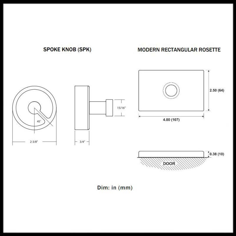 This Contemporary doorknob is Modern Brass and will give any door a unique style. The Emtek Spoke Knob has a Modern Rectangular Rosette and fits any door between 1-3/8” to 2-1/4" thick with a 2-1/8" bore standard door prep. Standard latch is for 2-3/8" backset. Includes Latch and Strike Plate. Available in a variety of different finishes.