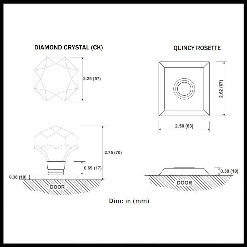 This American Heritage doorknob is Crystal and will give any door a unique style. The Emtek Diamond Crystal Knob has a Quincy Rosette and fits any door between 1-3/8” to 2-1/4" thick with a 2-1/8" bore standard door prep. Standard latch is for 2-3/8" backset. Includes Latch and Strike Plate. Available in a variety of different finishes.