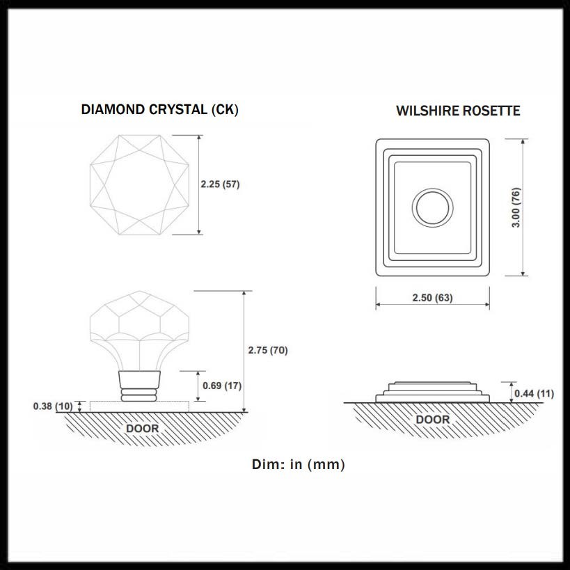 This American Heritage doorknob is Crystal and will give any door a unique style. The Emtek Diamond Crystal Knob has a Wilshire Rosette and fits any door between 1-3/8” to 2-1/4" thick with a 2-1/8" bore standard door prep. Standard latch is for 2-3/8" backset. Includes Latch and Strike Plate. Available in a variety of different finishes.