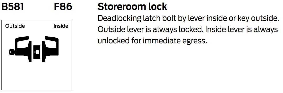 Falcon B581 Storeroom Lock Deadlocking latch bolt by lever inside or key outside. Outside lever is always locked. Inside lever is always unlocked for immediate egress. Standard B Series Lock is provided with, door thickness 1-3/8" to 2", backset 2-3/4". Options of finishes, lever styles.
