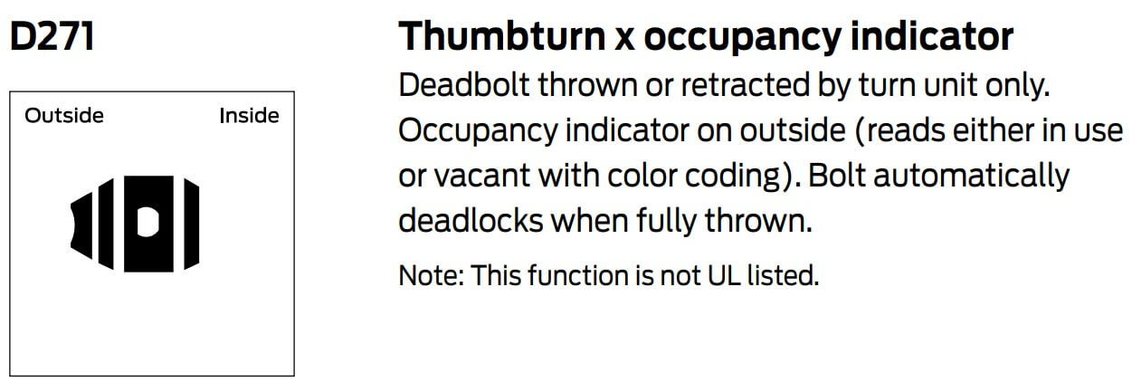 Falcon D271 Thumbturn, Inside x Rose Deadbolt thrown or retracted by turn unit only. Occupancy indicator on outside (reads either in use or vacant with color coding). Bolt automatically deadlocks when fully thrown. With door thickness 1-3/8" - 1-7/8", backset 2-3/8" - 2-3/4" adjustable, non-handed. Variety of finishes available.