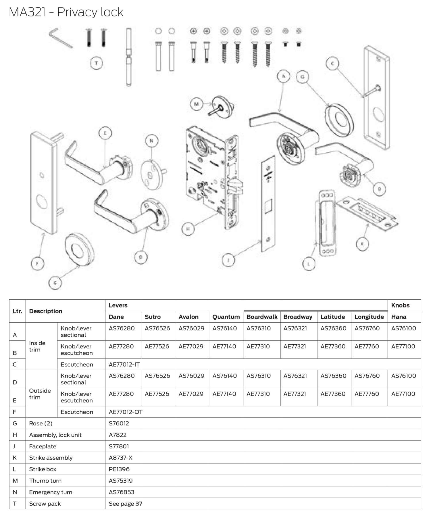 Falcon MA321 Lock Set's latch bolt operated by knob/lever from either side except when outside knob/lever is locked by inside turn. Operating inside knob/lever, closing door or operating outside emergency release unlocks outside knob/lever. Inside knob/lever always free for immediate egress. Standard lock provided with backset 2-3/4", Door Thickness 1-3/4".