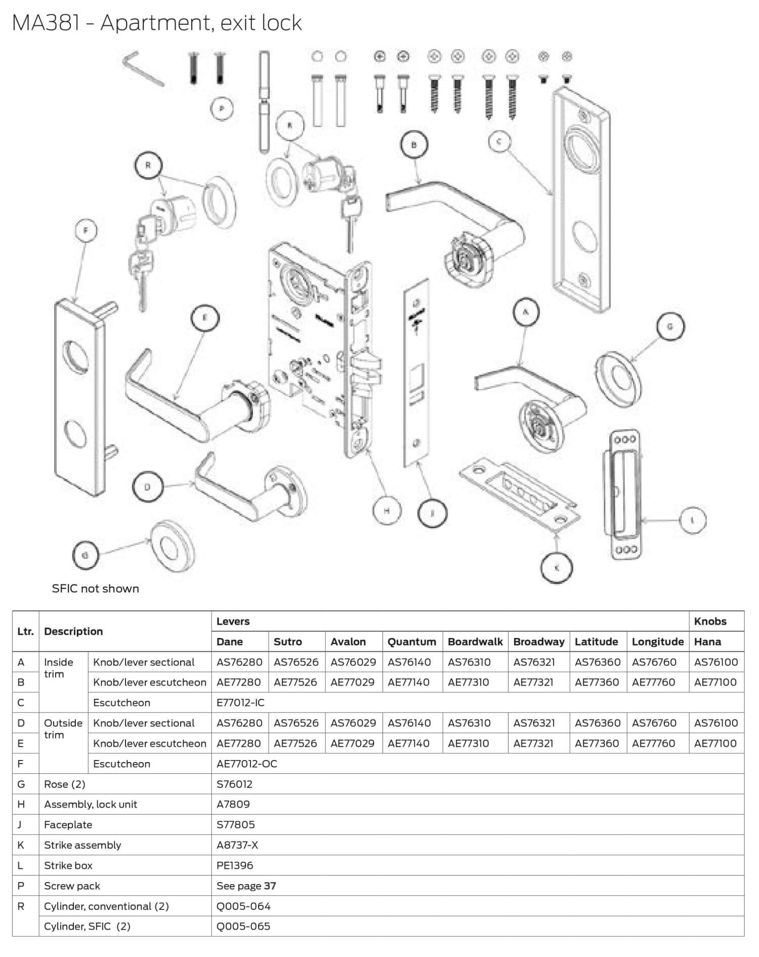 Falcon MA381 Apartment Exit Lock latch bolt operated by knob/lever from either side, except when outside knob/lever is locked by key from inside. When outside knob/lever is locked, latch bolt is retracted by key from outside or by operating inside lever. Auxiliary dead latch. Inside knob/lever is always free for immediate egress. Standard lock provided with backset 2-3/4", Door Thickness 1-3/4".