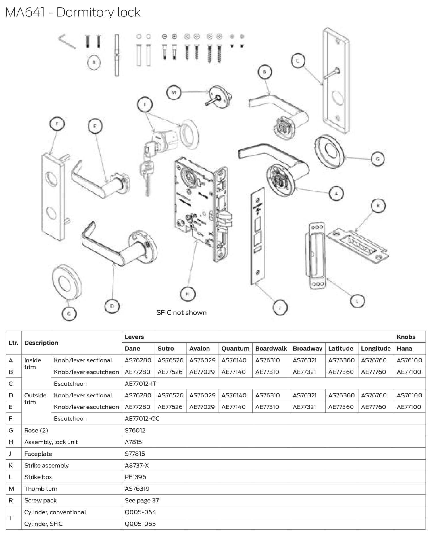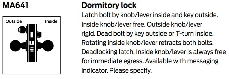 Falcon MA641 Dormitory Lock latch bolt by knob/lever inside and key outside. Inside knob/lever free. Outside knob/lever rigid. Dead bolt by key outside or T-turn inside. Rotating inside knob/lever retracts both bolts. Deadlocking latch. Inside knob/lever is always free for immediate egress. Available with messaging indicator. Standard lock provided with backset 2-3/4", Door Thickness 1-3/4".