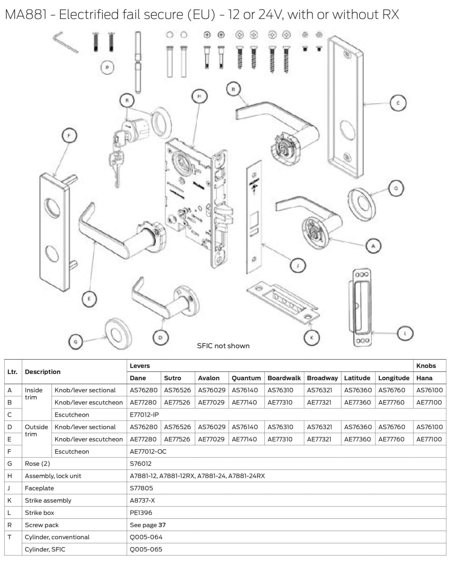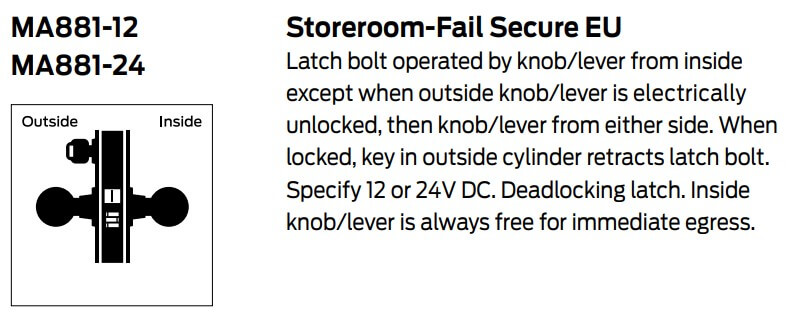 Falcon MA881-EU Lock Set's latch bolt operated by knob/lever from inside except when outside knob/lever is electrically unlocked, then knob/lever from either side. When locked, key in outside cylinder retracts latch bolt. Specify 12 or 24V DC. Deadlocking latch. Inside knob/lever is always free for immediate egress.. Standard lock provided with backset 2-3/4", Door Thickness 1-3/4".