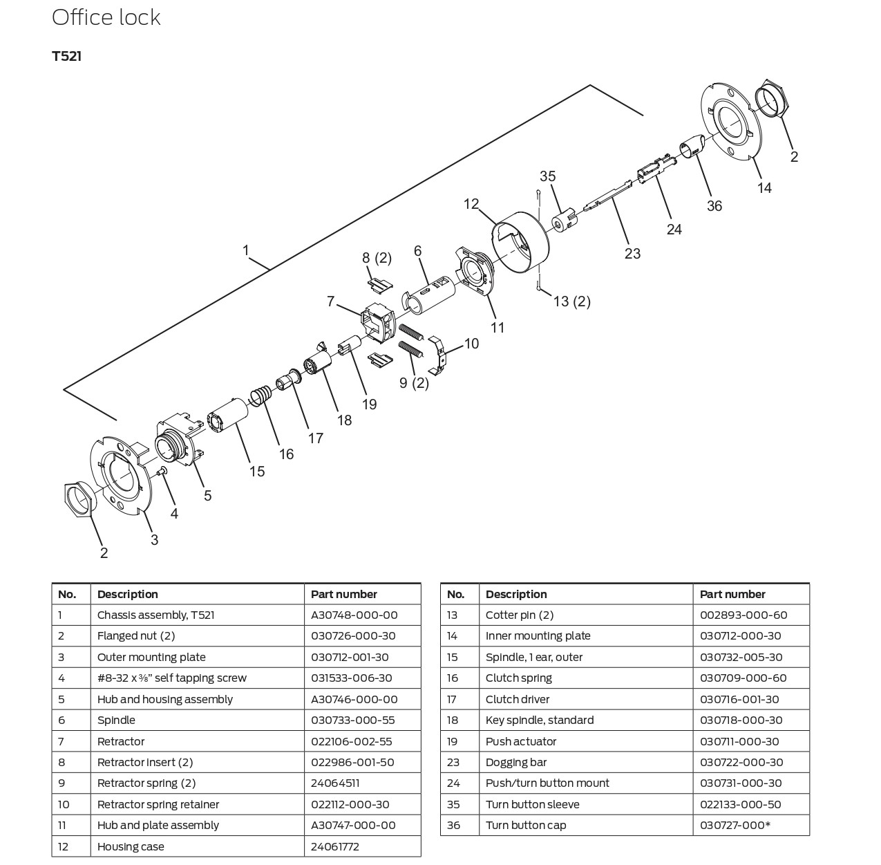 Falcon T521 Office Lock Turn button locking. Turning button locks outside lever requiring use of key until button is manually unlocked. Inside lever always free. Deadlocking latch bolt.  Product by default supplied with door thickness 1-3/4"-2-1/8", with a backset of 2-3/4".