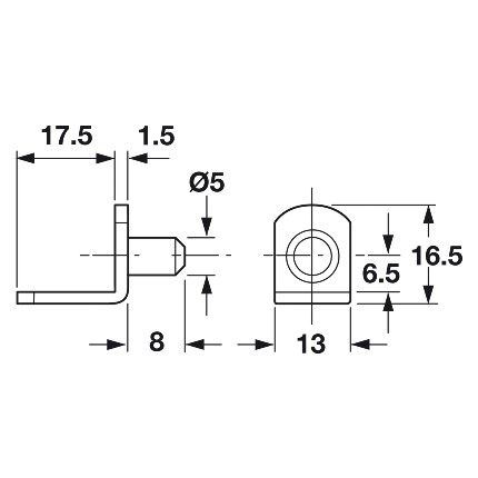 This Hafele Shelf Support is made from angular steel. It features a riveted pin and a securing hole for shelf installation. This can be installed by plugging into a 13/64" (5 mm) hole.