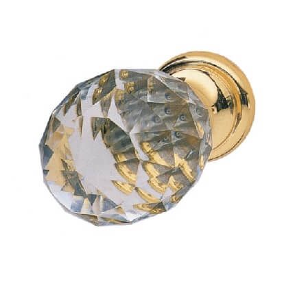 This round knob is made from crystal and has a clear finish, while the base is made from zinc and has a polished gold finish.