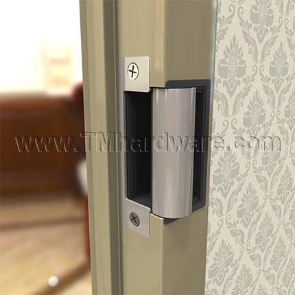 Faceplates fasten, embellish, and protect doors and electric strikes. It is the part that gets mounted onto the side of the door, surrounding the latchbolt. This HES HTD Option faceplate is compatible for use with the HES 1006 electric strike.
