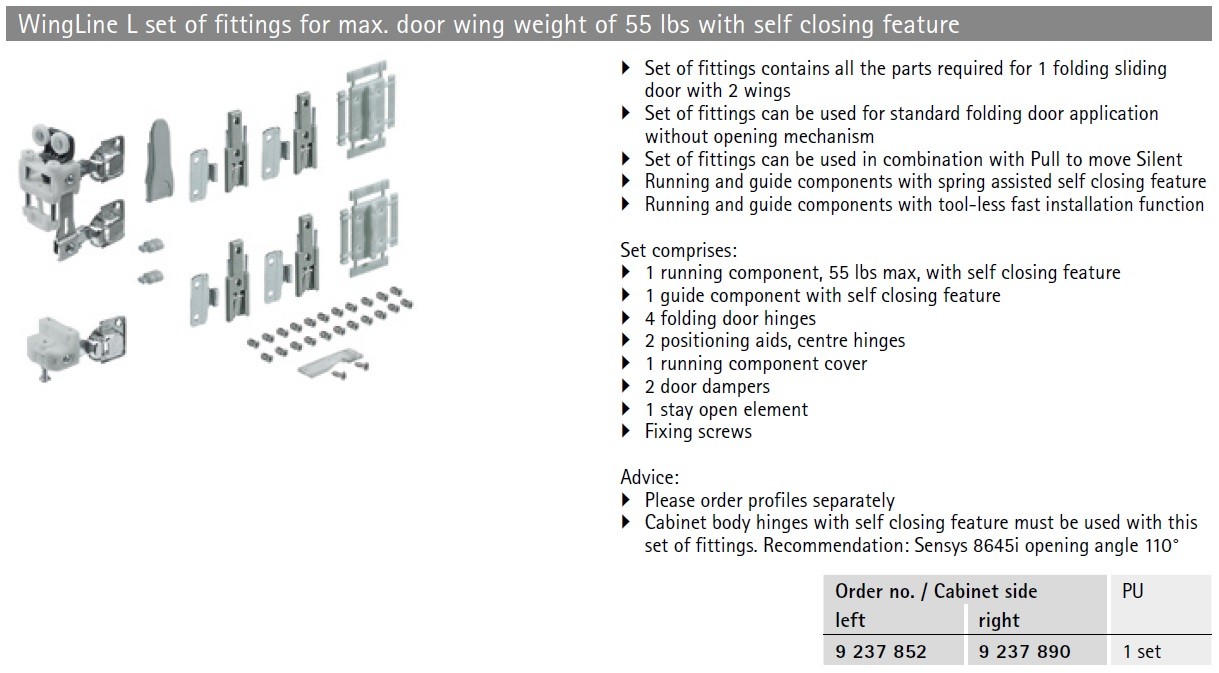 Hettich WingLine L Series is designed for wooden doors in overlay position, to create an impressive panoramic closet effect. Standard door hardware includes Soft Close Feature and is compatible with door wing weight up to 55LB, door height up to 94" and door width up to 24" wide. Runner Track Set, sold separately, is required for installation.