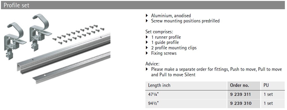 Hettich WingLine L Profile Set includes both the top runner profile and bottom guide profile, as well installation hardware. The included profile mounting clips allow for one person, simple installation process. Material is aluminum and is provided predrilled.