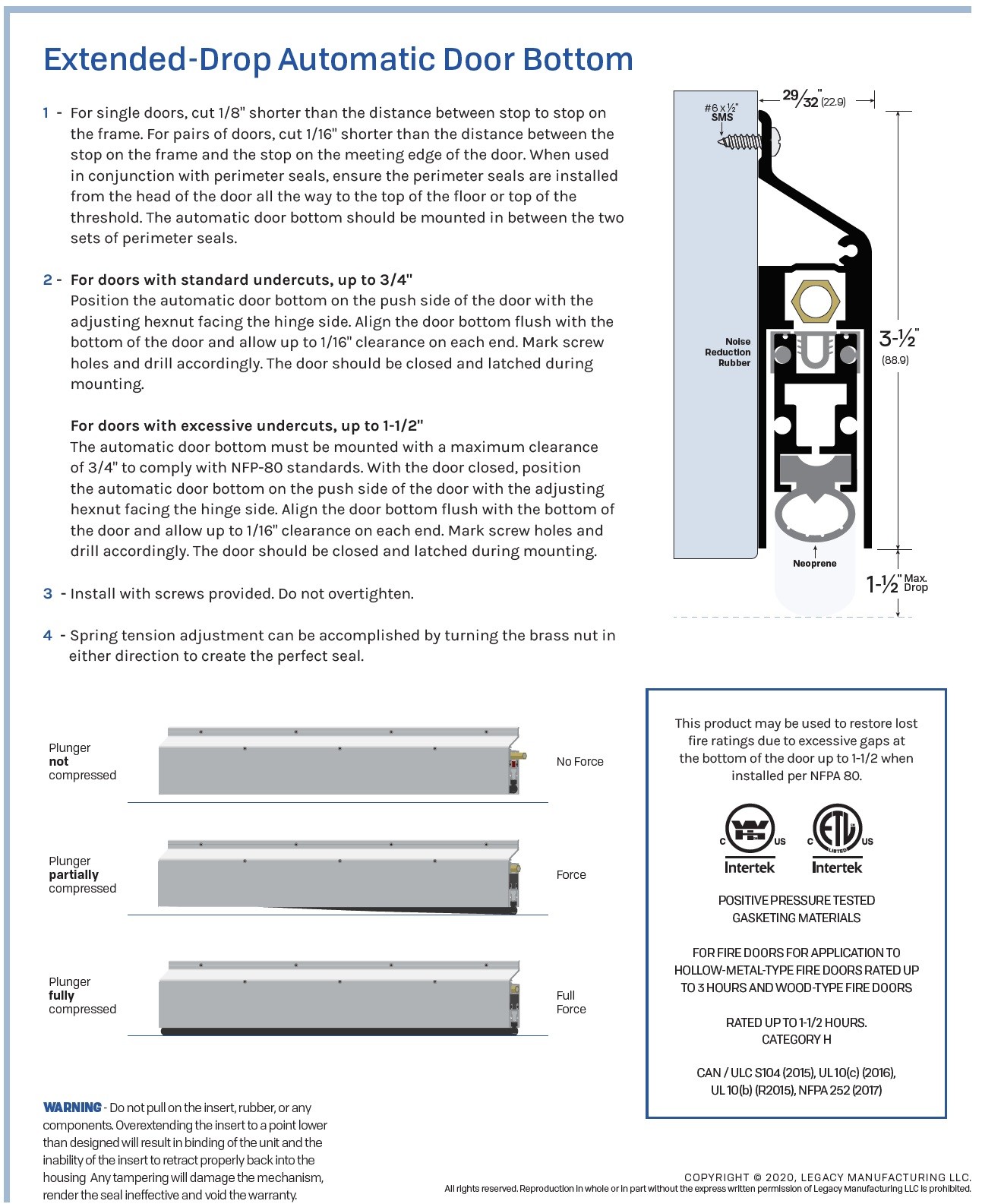 Legacy #7593 Extended Automatic Door Bottom, Heavy Duty, Neoprene Bulb, 1.5" Drop