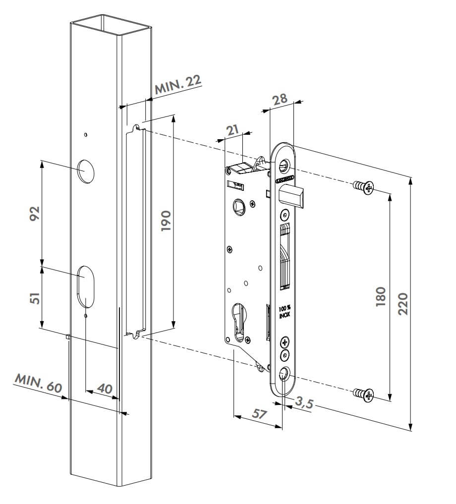 - Backset 40 mm, for mounting in profiles of 60 mm of depth or more