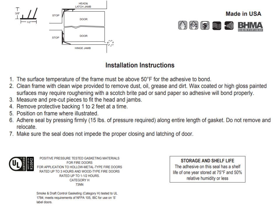 Compliance Details: REACH and RoHS compliant, Smoke and draft control; UL Certified Solution for Fire doors with Excessive clearance between door and frame over 1/8", up to 5/16" – when used along with NGP 9945 and 9400/9400DKB; ANSI/BHMA Certified; Positive Pressure Tested; Air Infiltration Rated; Anti-Microbial (Clear seals are not anti-microbial).