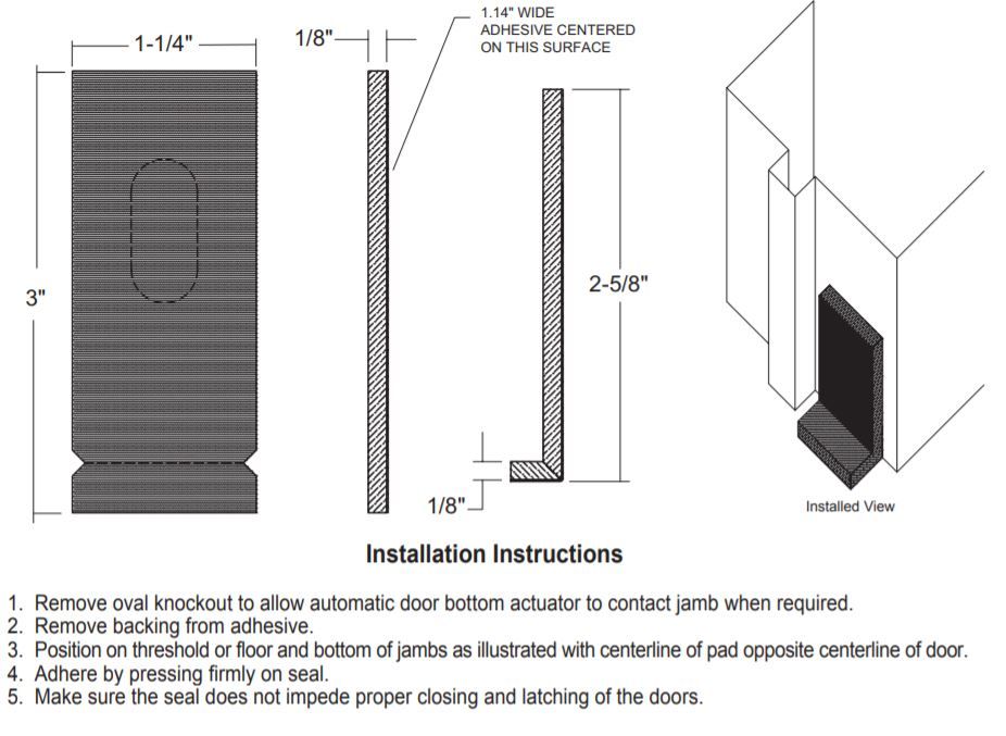 Installation: It is easily installed with an adhesive back and no mechanical fasteners are needed. It is applied to the bottom corner of the jamb on the hinge side of the frame and can be installed on the latch side of the door frame if the door has a standard 1/8" gap.