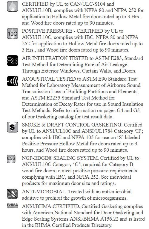 Compliance Details: REACH and RoHS compliant, Smoke and draft control; NGP-Edge® Sealing System/Smoke and Draft Control Gasketing Category “G” and “H” Classified; ANSI/BHMA Certified; 20, 45, 60, 90 minute rated category B wood doors perimeter application up to: single swing 4'0 x 9'0, standard pair 8'0 x 9'0 use 9550 at the meeting edge; Positive Pressure Tested; Air Infiltration Rated; Anti-Microbial; Accoustical Tested.