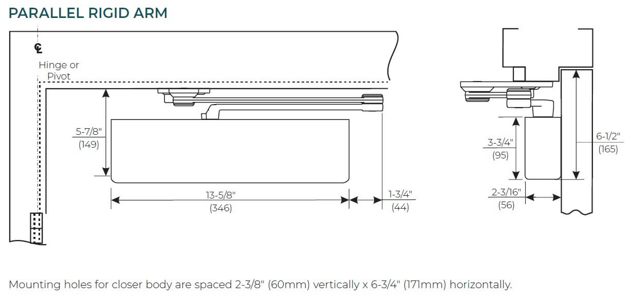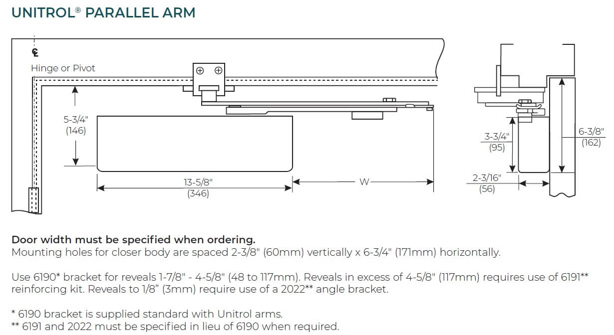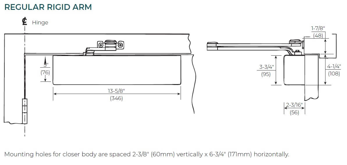 Arm TypeRegular rigid arm (NHO), Parallel Rigid Arm (NHO), CloserPlus® Arm (NHO), CloserPlus Spring™ arm (NHO), Unitrol® parallel arm (NHO), Pull side slide track (NHO), Low profile, push side slide track (NHO), CloserPlus® arm (HO), CloserPlus Spring™ arm (HO)
