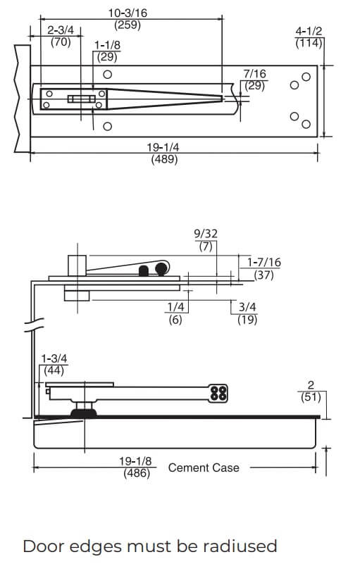 - Frame stop required on lock edge; if not supplied by frame manufacturer, Norton Rixson 60131 is recommended