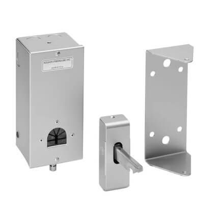 Swinging doors can be released using Rixon's 972H industrial door release. This heavy-duty unit releases automatically when activated by a smoke alarm, manual pull station, unit test button, or other electrically driven switch.