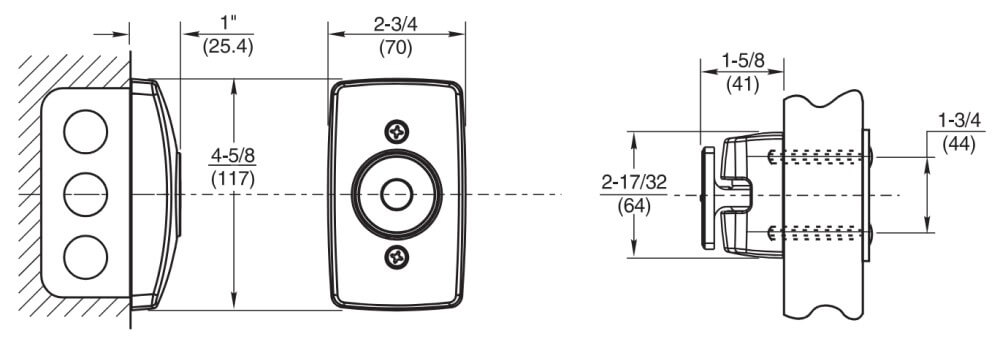 This wall-mounted 997M electromagnetic door holder from Rixson has a total projection of 2-5/8". Their principal function is maintaining the open position of fire and smoke barrier doors until a remote smoke detector or other switching device activates them.