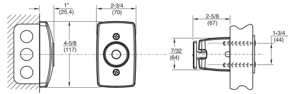 This wall-mounted 998M electromagnetic door holder from Rixson has a total projection of 3-5/8". Their principal function is maintaining the open position of fire and smoke barrier doors until a remote smoke detector or other switching device activates them.